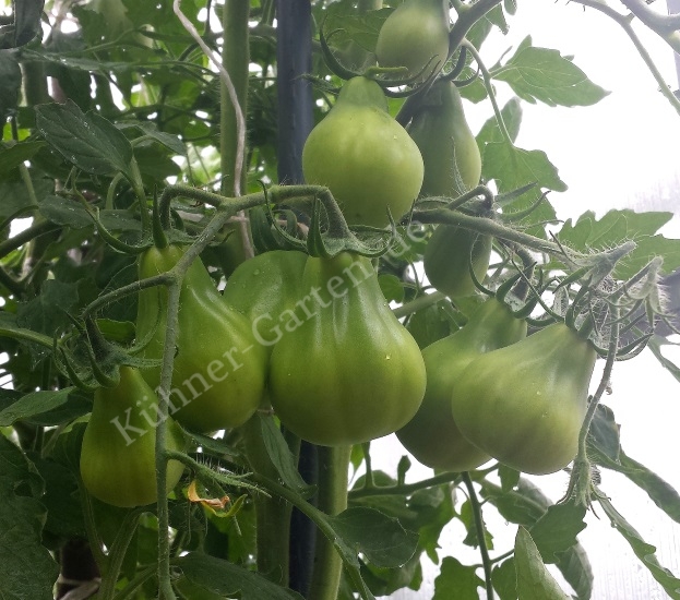 Eine ganz besonders produktive Sorte mit Birnen ähnlichen Früchten, die leicht grün geflammt.
