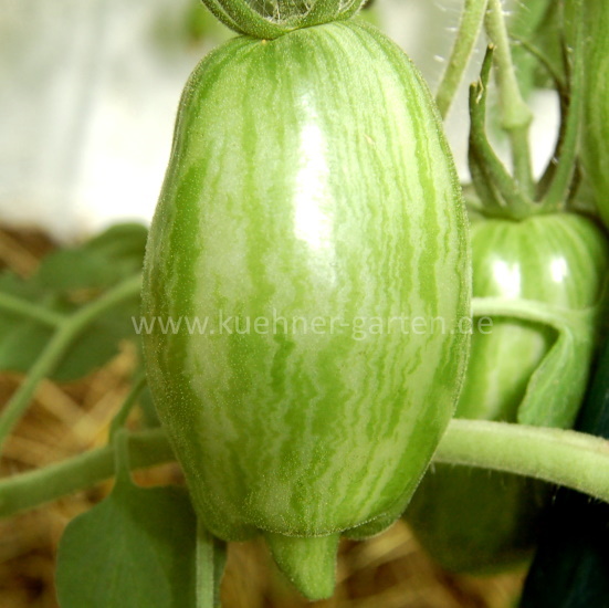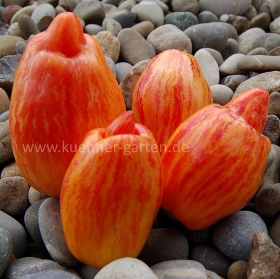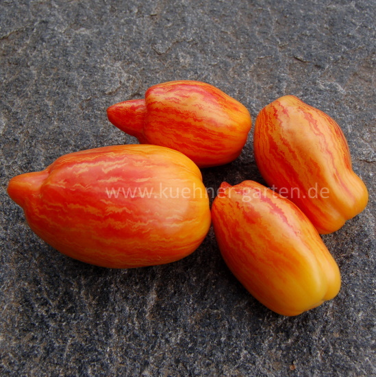 Früchte: gelb-orange-rot gestreift, paprikaförmig, sehr süß, fruchtiger Geschmack, fest, glänzend