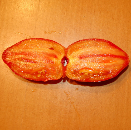 Die Tomaten werden 5–6 cm im Durchmesser, bis zu 12 cm lang und können ein Gewicht von bis zu 250 g erreichen. Die hornförmigen Früchte variieren etwas in Größe und Gestalt – manche besitzen eine deutlich ausgeprägte Spitze, andere eine leicht eingezogene.