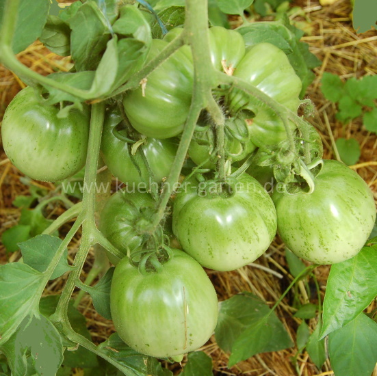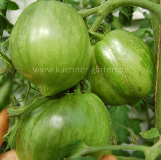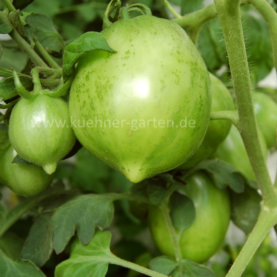 Früchte: rot mit orangefarbenen Streifen, birnenförmig/herzförmig mit ausgeprägter Spitze, wohlschmeckend, aromatisch, fest