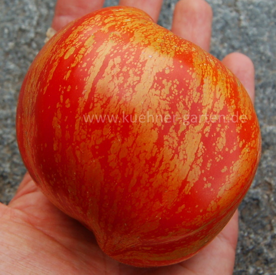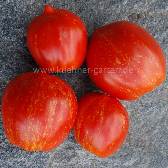 Die Früchte sind pflaumenförmig bis leicht herzförmig und besitzen am Blütenende eine kleine Spitze. Ihre Farbe ist dunkelrot, durchzogen von goldenen Streifen, Sprenkeln und feinen Zeichnungen – optisch erinnert sie an die Sorte "Feuerwerk".