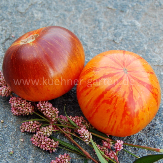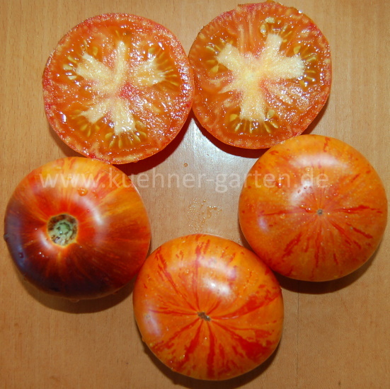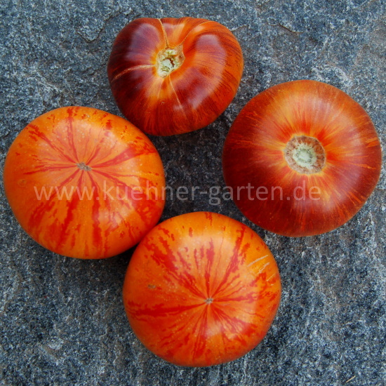 Früchte: mehrfarbig: gelb-orange-rot gestreift mit schwarzlila Schultern, flachrund, sehr süß, zartschmelzend, fruchtiger Geschmack
