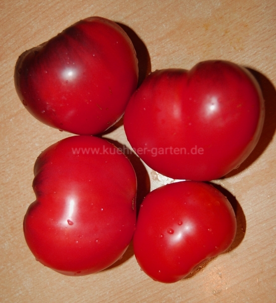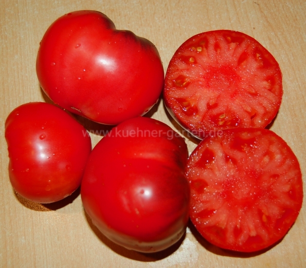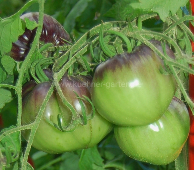 Je nach Sonnenintensität färbt sich die der Sonne zugewandten Tomatenseite lila bis schwarz und die der Sonne abgewandte Tomatenseite rosa.