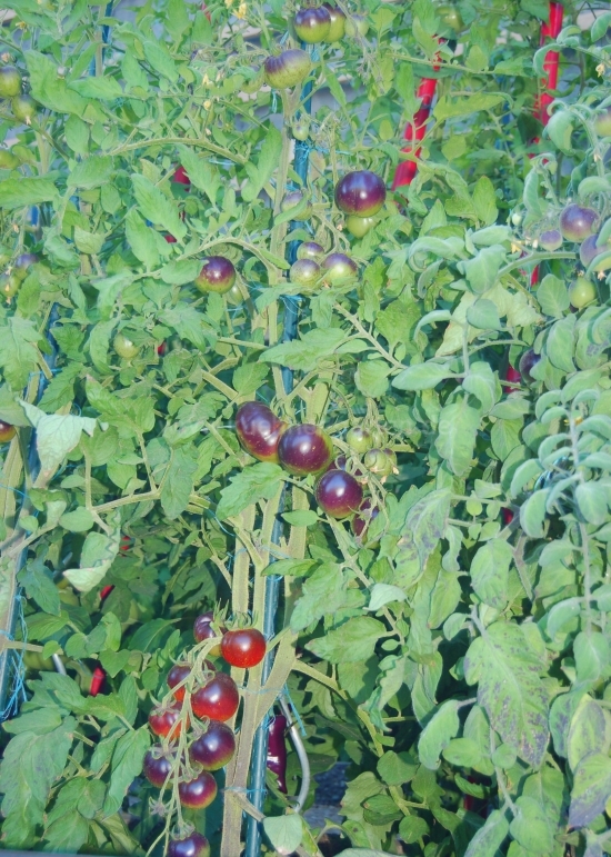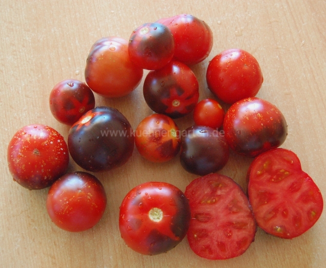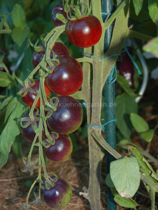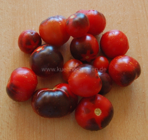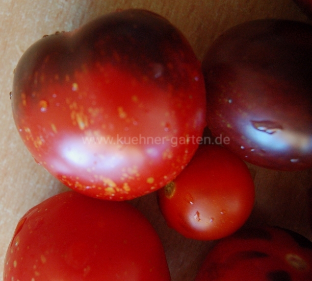 Je nach Sonnenintensität färbt sich die der Sonne zugewandten Tomatenseite lila bis schwarz und die der Sonne abgewandte Tomatenseite rot-orange.