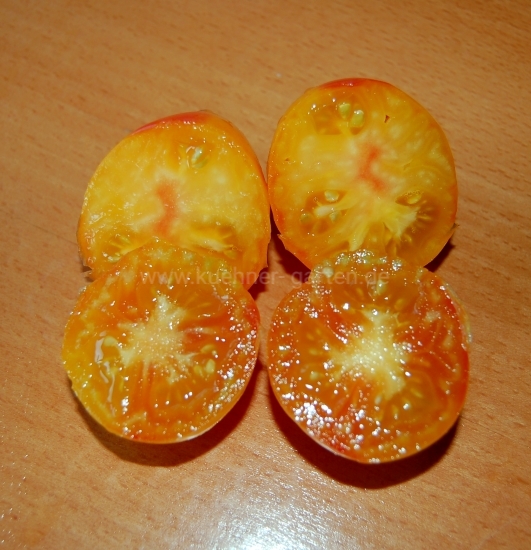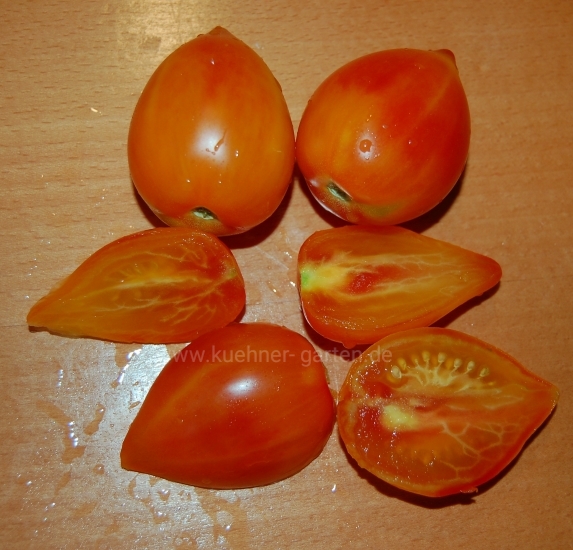 Die Früchte der "Marinas Praise" sind herzförmig, gelb-orange mit feinen rosa Streifen durchzogen. Das Fruchtfleisch ist auch gelb-orange-rosa.