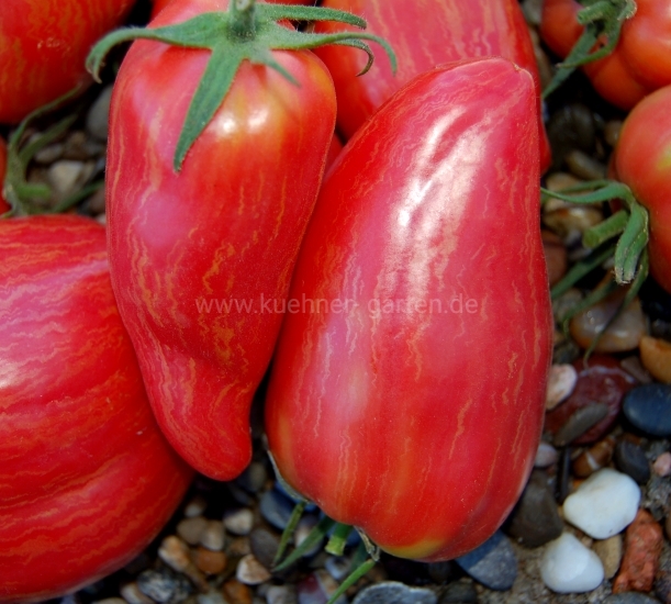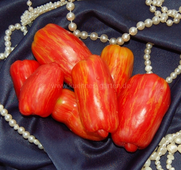 Früchte: rosa mit orangen Streifen, paprikaförmig, sehr süß, fruchtiger Geschmack, fest, glänzend