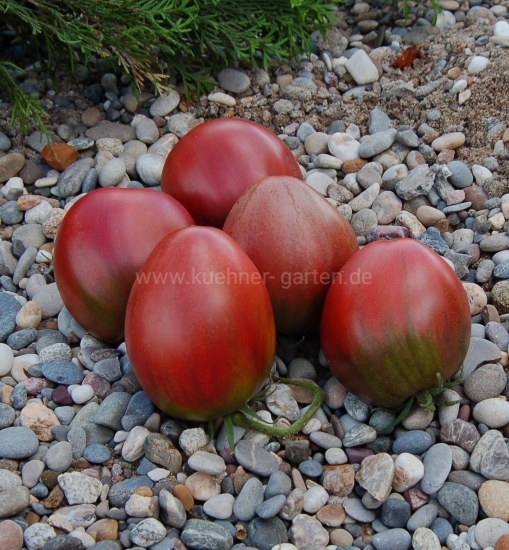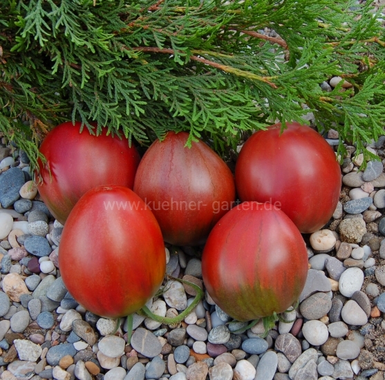 Diese Sorte ist durch ihre Fruchtform und die intensive Farbe besonders auffällig. Ihre ertragreiche Pflanzen tragen herzförmige schokoladenfarbige Früchte mit olivgrünen Schultern.