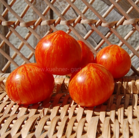 Früchte: mehrfarbig: rot mit goldenen Streifen, herzförmig, süß, aromatisch, fest, lange lagerfähig