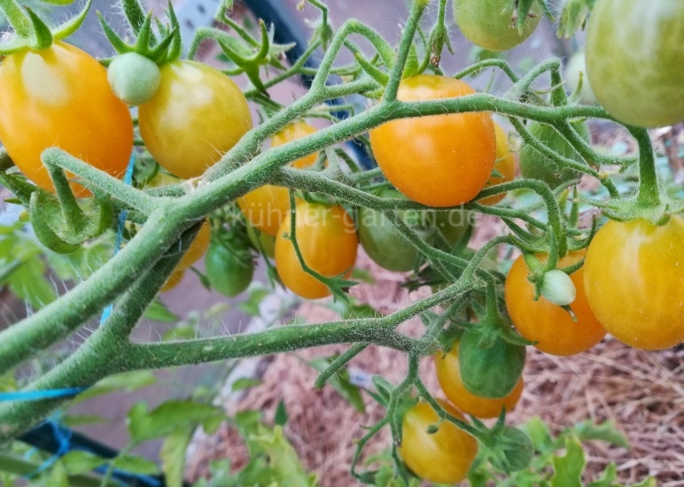 Diese Sorte zählt zu den sogenannten Multiflora Tomaten. Sie bildet riesige fächerartige Fruchtstände mit zahllosen Blüten und produziert massenhaft kleine gelbe Früchte.