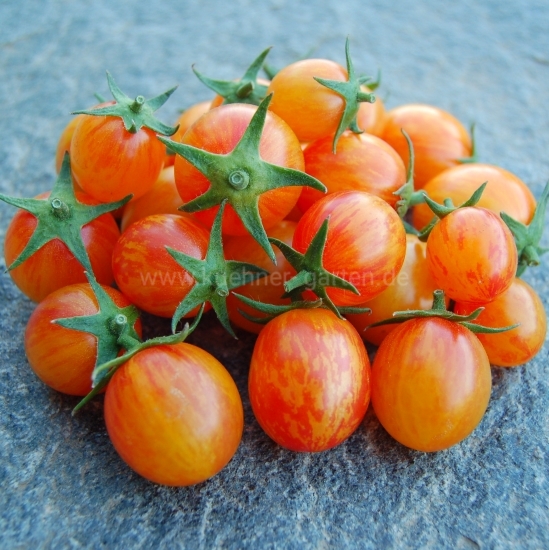 Die "Sunrise Bumble Bee" ist eine bildhübsche, mehrfarbige Cherrytomate aus den USA.
