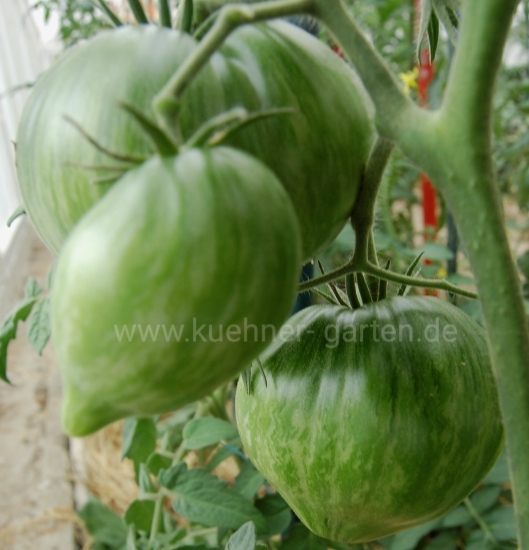 Früchte: dunkelrosa-rot mit silbergrünen Streifen, herzförmig, süß, aromatisch