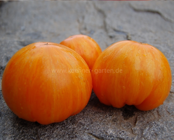 Früchte: orange mit gelben Streifen, herzförmig oder flachrund, leicht gerippt, süß, fruchtiger Geschmack
