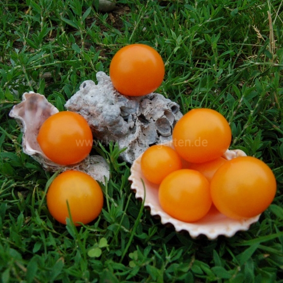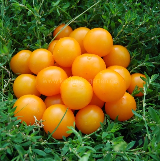Die Pflanze verzweigt sich stark und bringt viele gelbe, kleine und runde Tomaten hervor. Ihre Früchte haben einen süßen fruchtigen Geschmack und eine mittelweiche Schale.