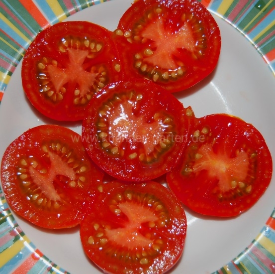 Die runden glänzenden Tomaten haben ein saftiges Fruchtfleisch, 2 bis 3 Fruchtkammern und 5 bis 6 Kelchblätter. Die Haut ist weich, aber trotzdem recht platzfest, der Geschmack fruchtig und angenehm süß-säuerlich.