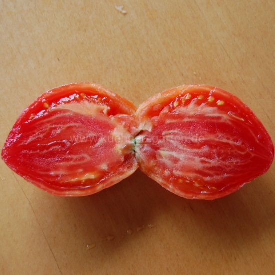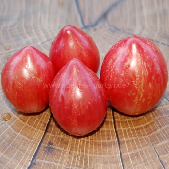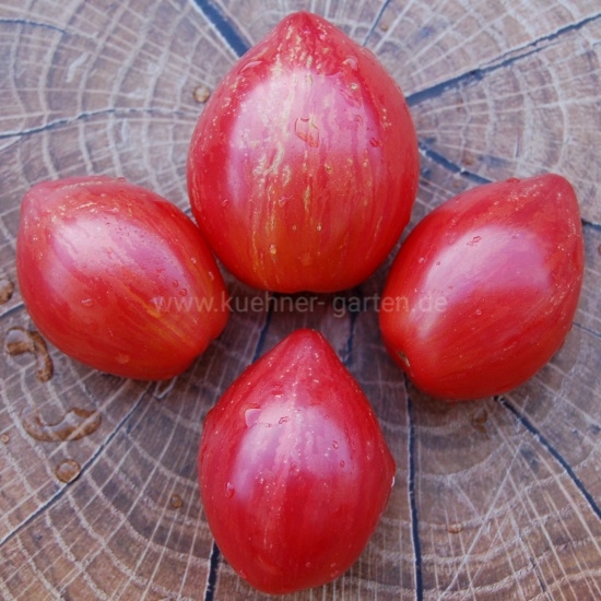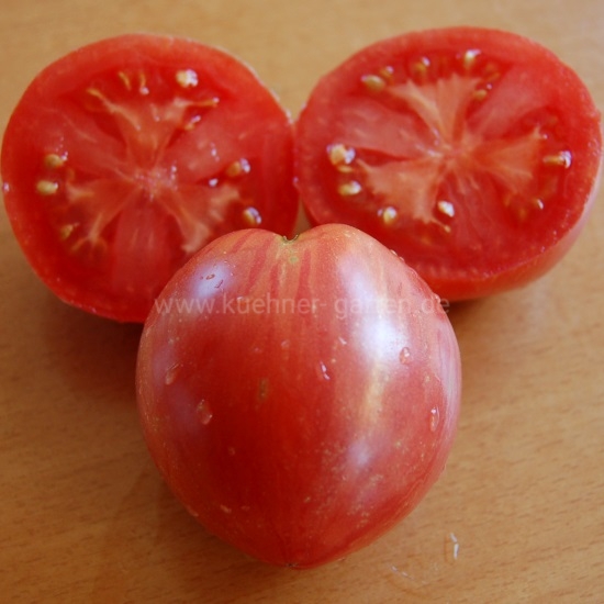 Früchte: rosa mit hellrosa Streifen, herzförmig, süß, fest, aromatisch