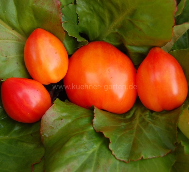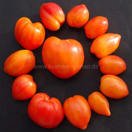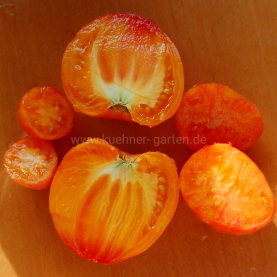 Früchte: mehrfarbig: gelborange-rosa, herzförmig, sehr süß, fruchtiger Geschmack, aromatisch
