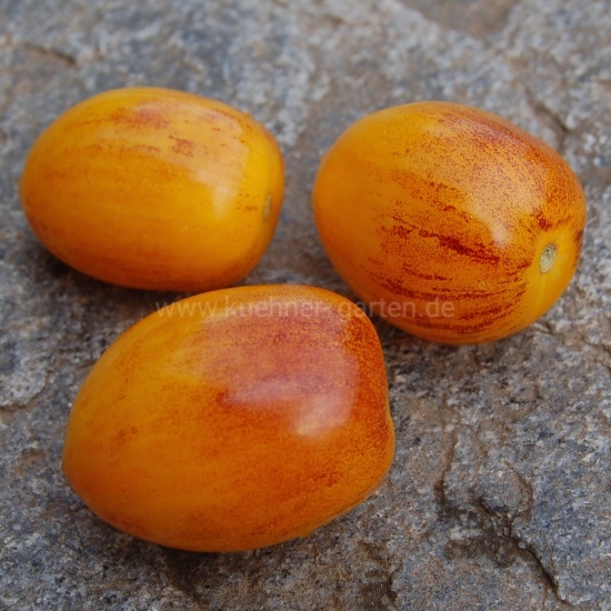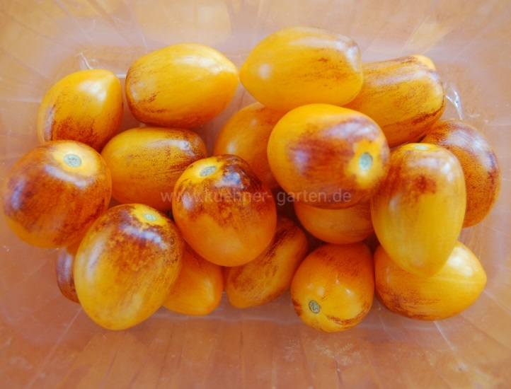 Je nach Sonnenintensität färbt sich die der Sonne zugewandten Tomatenseite lila bis schwarz und die der Sonne abgewandte Tomatenseite gelb-orange.
