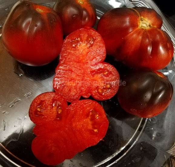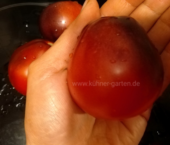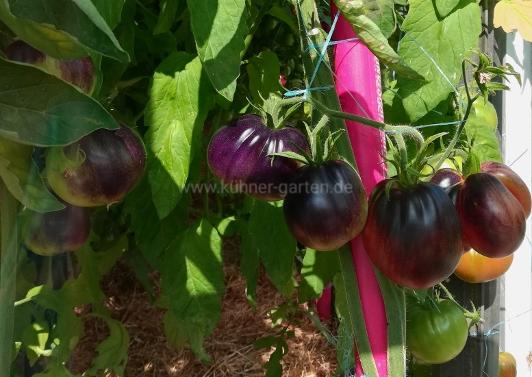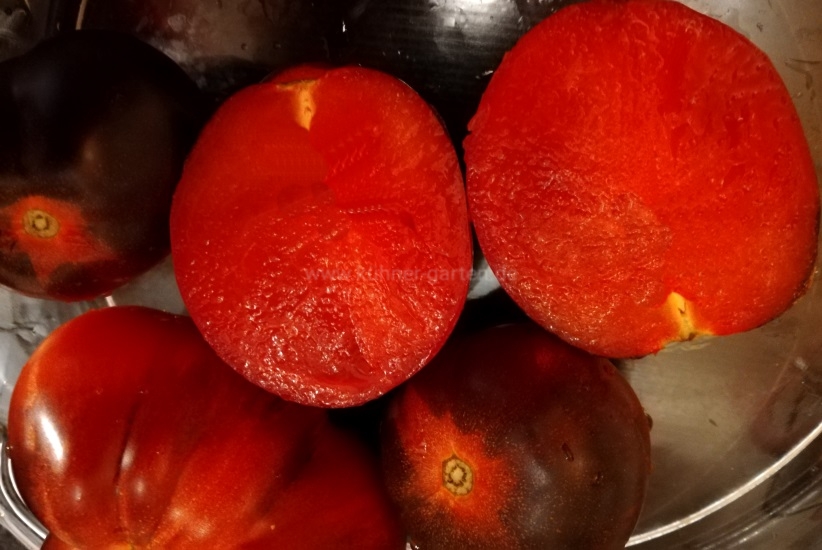 Je nach Sonnenintensität färbt sich die der Sonne zugewandten Tomatenseite lila bis schwarz und die der Sonne abgewandte Tomatenseite gelb-orange-rot.
