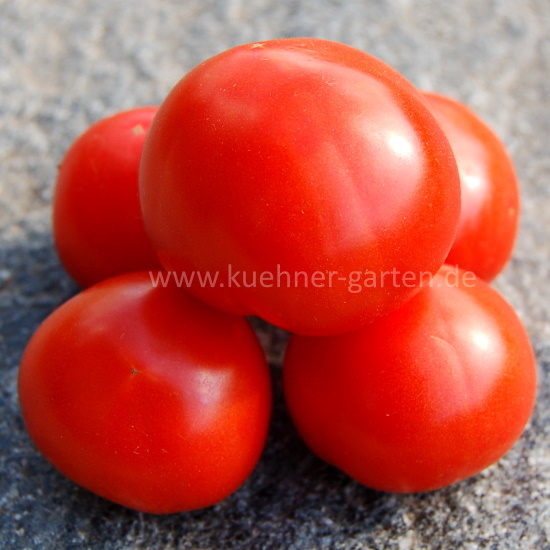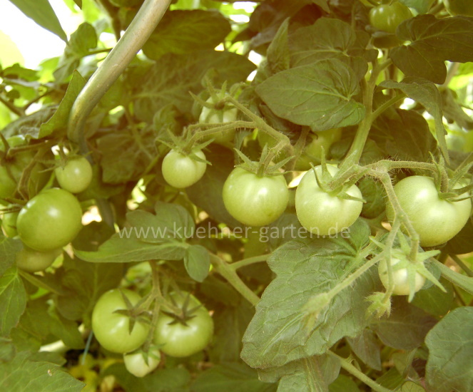 Die normalblättrigen Pflanzen haben dichtes, dunkelgrünes Laub und werden nur etwa 50cm hoch. An den verzweigten Rispen wachsen jeweils bis zu 10 Tomaten heran.