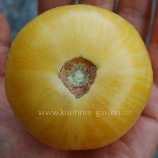 Sie ist eine dekorative, sehr weichschalige Tomate mit samtiger Haut. So ähnlich wie bei einem Pfirsich.