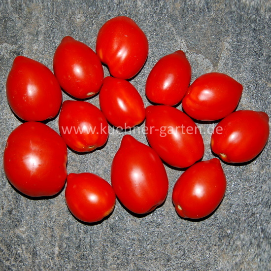 Früchte: knallrot; in Form einer prallen Pflaume, teils mit Rillen oder herzähnlich; süß, aromatisch, wohlschmeckend, fleischig