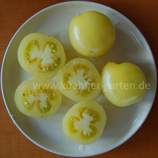 Die kleinen elfenbeinfarbigen leuchtenden Tomaten schmecken unglaublich fruchtig und süß, haben ein ausgezeichnetes erfrischendes Aroma.