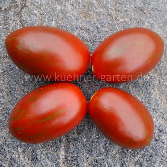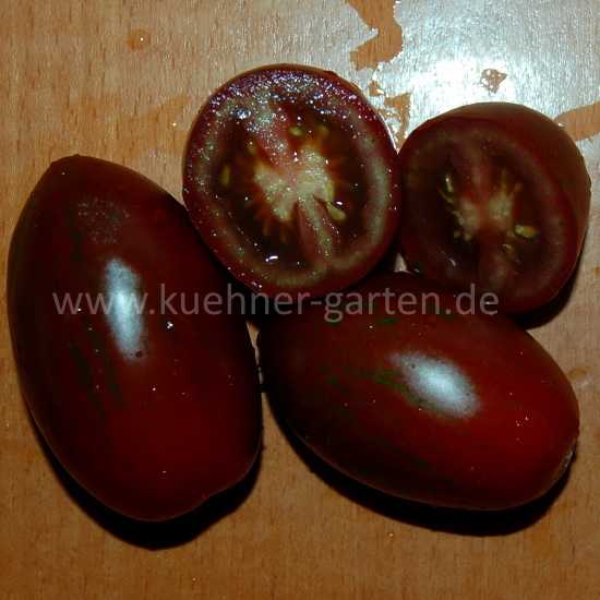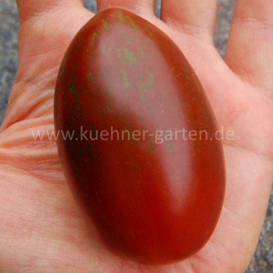Früchte: schokoladenfarbig mit grünen Streifen, oval mit einer Spitze, süß, fest, lange lagerfähig