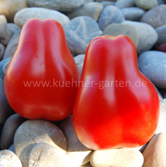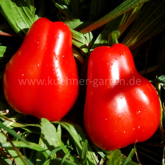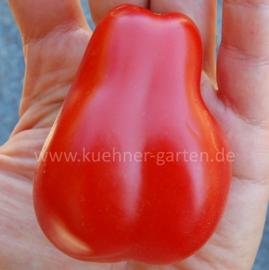 An dieser Sorte ist einfach alles wunderbar! Sie bekannt für ihre birnenförmige, längliche Form mit einem "Hals" und einen intensiven, ausgewogenen süß-säuerlichen Geschmack. Sie eignet sich hervorragend für Soßen, Pasta und den Frischverzehr. Die Sorte ist indeterminiert, sehr ertragreich und bei Sammlern besonders geschätzt.