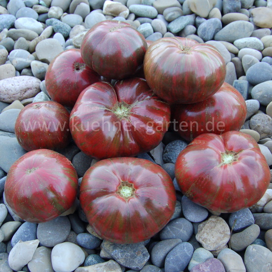Die Früchte sind schokoladenfarbig mit grünen Streifen. Sie schmecken köstlich, süß und fruchtig.