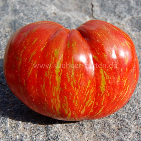 Früchte: mehrfarbig: burgunderbraun mit olivgrünen Streifen; herzförmig, teilweise leicht gerippt; sehr süß, fruchtiger Geschmack und Aroma