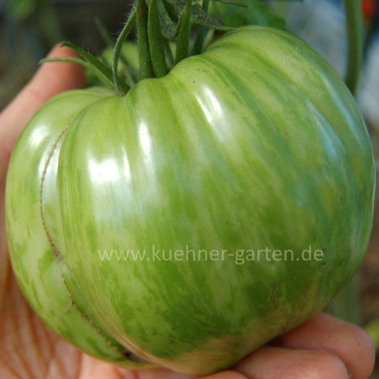 Sie ist sehr kontrastreich und liefert ein richtiges Farbspektakel während der Vegetationsphase. Ihre Früchte sind zunächst grün mit dunkelgrünen Streifen. Mit zunehmender Reife wechseln sie allmählich die Farben und zeigen ein lebendiges Farbenspiel. Innen bordeauxrotes Fruchtfleisch.