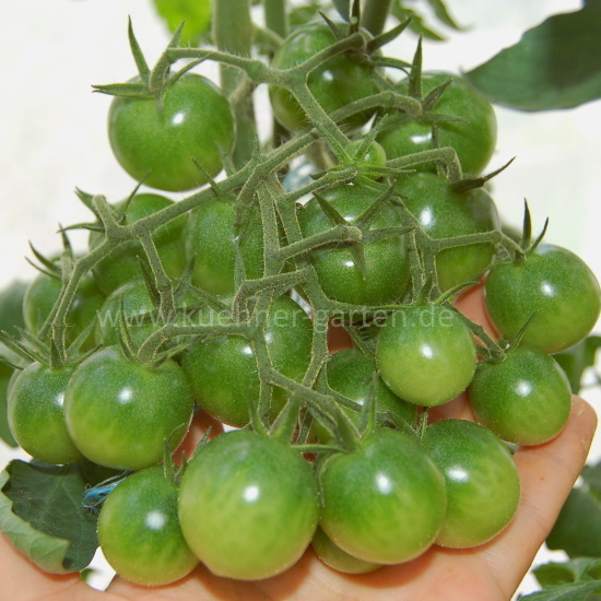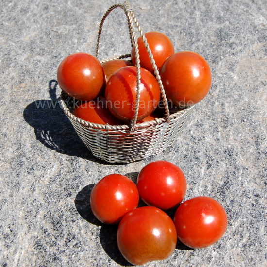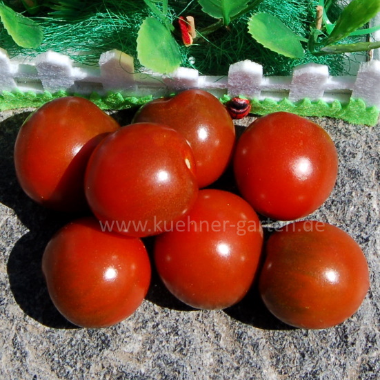 Die "Mini Kumato Cherry" ist eine sehr süße, ertragreiche Cherrytomate mit einem hohen Gehalt an Anthocyanen. Die Früchte sind fest und glänzend und können für Schokoladentomaten relativ lange gelagert werden.